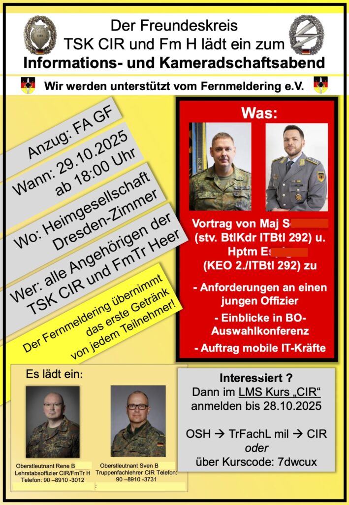 Der fünf­te Kame­rad­schafts­abend des Jah­res 2025 an der Offi­zier­schu­le des Hee­res (OSH) für die Fern­mel­de- und CIR-Offi­zie­re bot dies­mal für sei­ne Teil­neh­mer ein ganz beson­de­res „High­light“: Der Stell­ver­tre­ten­de Kom­man­deur des IT-Batail­lons 292 (ITBtl 292) und der Kom­pa­nie­ein­satz­of­fi­zier der 2./ITBtl 292 tru­gen zu Auf­trag der mobi­len IT-Kräf­te der TSK CIR und Glie­de­rung eines IT-Batail­lons sowie Erwar­tun­gen an einen jun­gen IT-Offi­zier vor und gaben Ein­bli­cke in die Berufs­of­fi­zier­aus­wahl­kon­fe­renz.