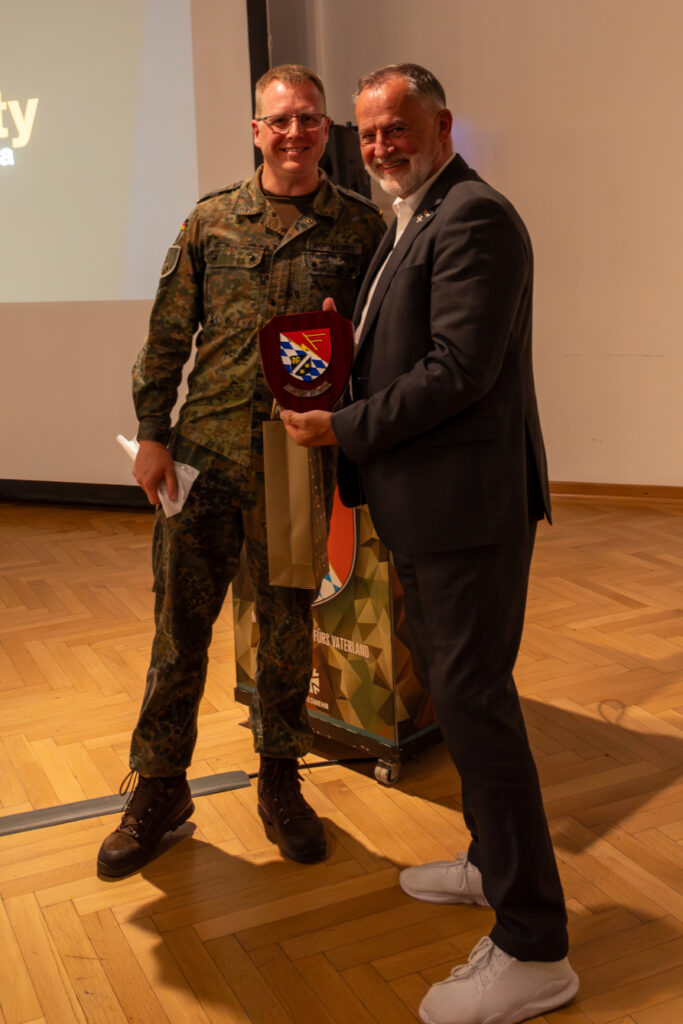 Der Kommandeur des Informationstechnikbataillons 292, Oberstleutnant Torge Bornhöfft, überreicht dem Gastredner des IT-Stammtisches, Herrn Hermann Huber, als Dank das Bataillonswappen