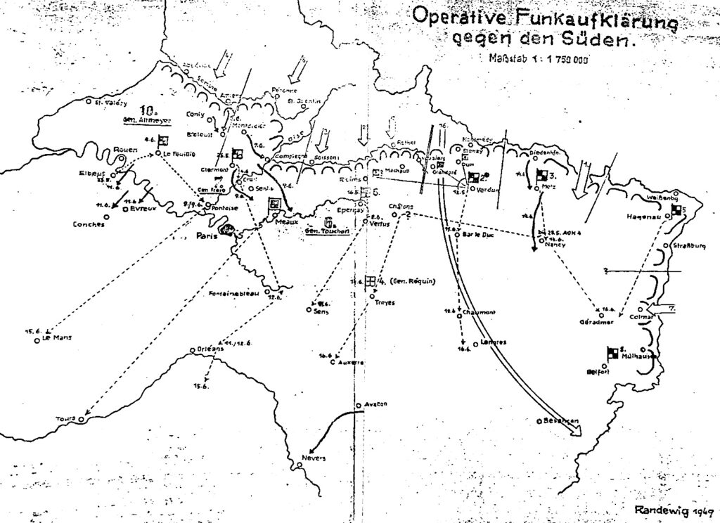 Am 13. Juni wurde durch die Funkaufklärung eine Rundfunkmeldung mit dem französischen Entschluß zum Rückzug auf und hinter die Loire erfasst, danach begann ab 15. Juni der Zusammenbruch des geregelten französischen Funkverkehrs, so daß nur noch die Bewegungsrichtungen der französischen AOK[9] durch Peilauswertung überwacht werden konnten.