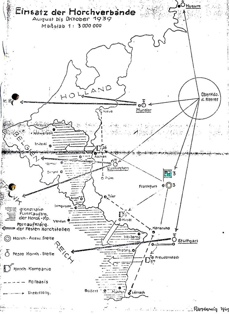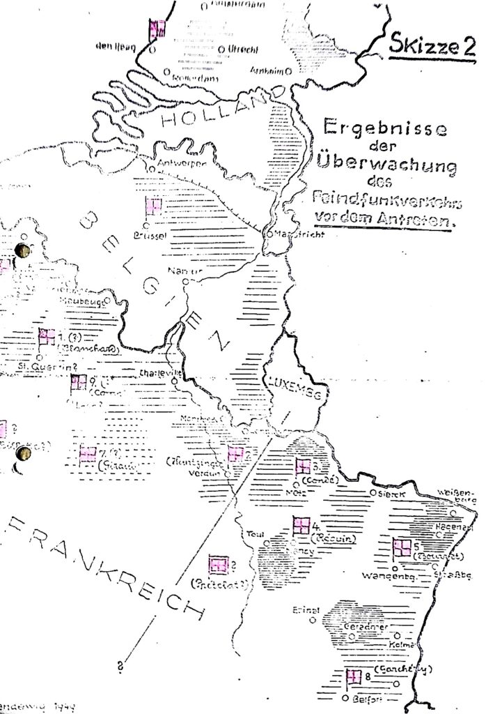 Bis zum Beginn des Angriffs auf die Niederlande, Luxemburg, Belgien und Frankreich waren allerdings die Ergebnisse von Horchdienst bzw. Funkaufklärung gegenüber dem Nordflügel zwischen Nordsee und luxemburgisch-französischer Grenze aufgrund der z.T. großen Entfernungen (z.B. Münster — Lille (Frankreich): ca. 380 km), aber auch weitgehender Funkstille nicht besonders ergiebig und überwiegend technischer Natur. Insofern wurden nur taktische Teilergebnisse erzielt, die andere Quellen ergänzten oder bestätigten – die operative Gliederung dagegen konnte durch die Funkaufklärung nicht voll gedeutet werden, lediglich die mutmaßlichen Aufmarschräume [3] der niederländischen und belgischen Armee sowie der französischen Armeen und der britischen Armee (mit drei Armeekorps, fünf aktiven, teilmotorisierten Divisionen und mehreren Divisionen 2. — 3. Welle) wurden festgestellt, ohne daß jedoch deren Gefechtsstände zuverlässig geortet werden konnten.