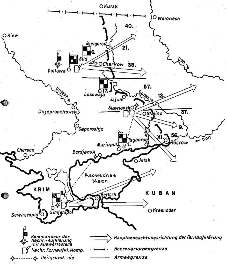 Bei der Funkaufklärung zunächst bis zum Donez wurde im Übrigen festgestellt, daß die Führungsebene „Korps“ weggefallen war, was aus dem unmittelbaren Funkverkehr zwischen den Divisionen und Armeen hervorging, und daß eine neue Führungsebene „Front“ vergleichbar der deutschen Heeresgruppe hinzugekommen war, was insgesamt auf eine Konsolidierung der sowjetischen Verteidigung hindeutete. Dies spiegelte sich auch in einer zunehmenden Beschränkung des Funkverkehrs zwischen den Divisionen und Armeen wieder, was aber durch verstärkte Funknahaufklärung durch die Divisionsnachrichtennahaufklärungszüge unter Leitung einer der Horchkompanien kompensiert werden konnte und es sogar ermöglichte, aus dem größtenteils schlecht verschleierten Sprechfunkverkehr weitreichende Schlüsse zu ziehen.