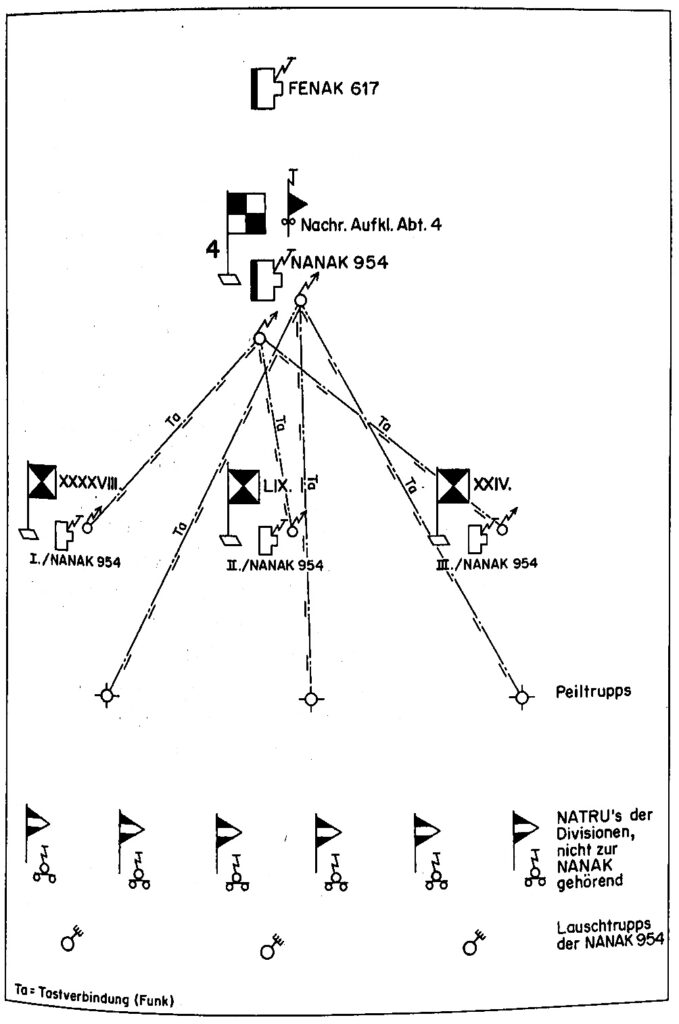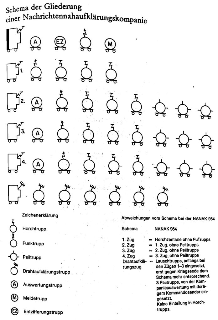 Die NANAK waren in vier Nachrichtennahaufklärungszüge und einen Peilzug mit drei neuen, tragbaren Kurzwellen-Nahfeldpeilgeräten [2] für den Bodenwellenbereich gegliedert.