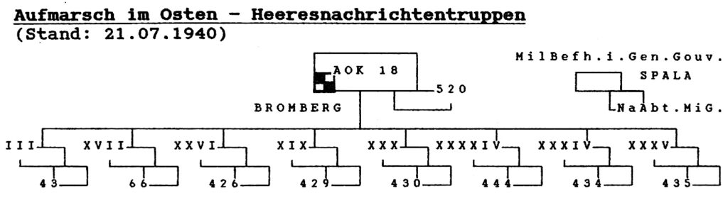 Die nachrichtentechnische Vorbereitung des ab Mai 1941 beabsichtigten Rußlandfeldzugs begann bereits Ende Juli 1940 im Zusammenhang mit der Verlegung des Armeeoberkommandos (AOK) 18 nach Bromberg/Bydgoszcz und dessen Befehlsübernahme über die in das sogenannte „Generalgouvernement“ in Polen verlegten bzw. dort bereits stationierten acht Armeekorps und 15 Divisionen.