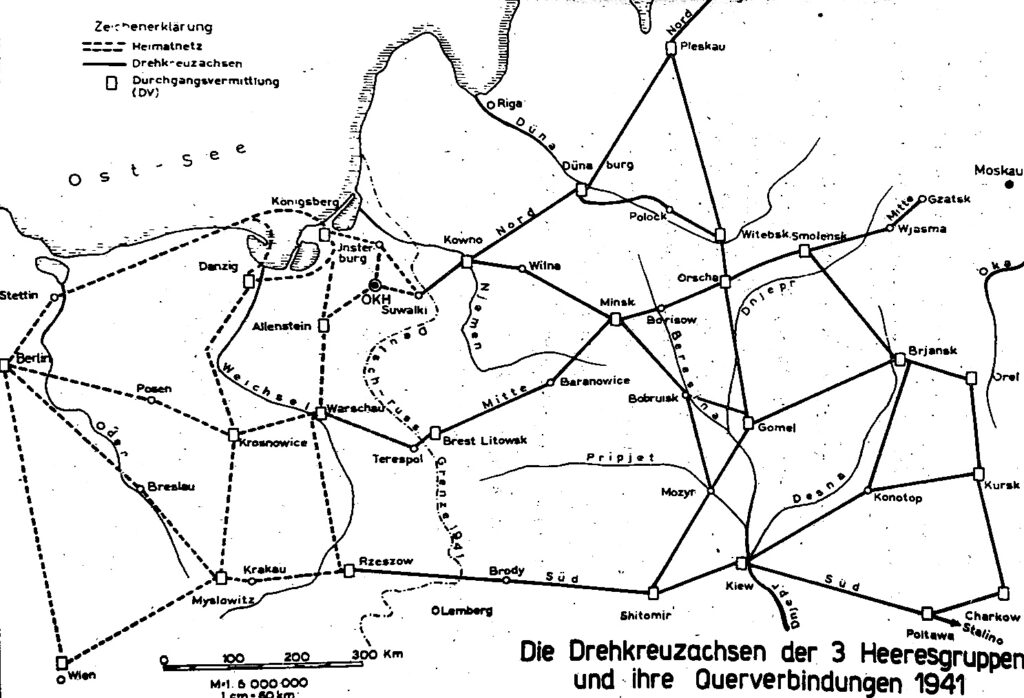 Im Bereich der HGr Nord gab es zwei „Drehkreuzachsen“, die im Zuge des Vormarsches der AOK 16 und 18 sowie der PzGrp 4 verliefen. Bei der HGr Mitte folgte die „Drehkreuzachse“ der Trasse Brest-Litowsk – Minsk – Smolensk und im Bereich der HGr Süd teilte sich in Kiew die „Drehkreuzachse“ Rzeszow – Lemberg/Lwiw – Kiew/Kyjiw in einen südostwärts und einen nordostwärts führenden Zweig, der sich seinerseits in Konotop nochmals verzweigte, was auf das Hinundher im Herbst 1941 hinsichtlich der weiteren Operationsführung zurückzuführen war.