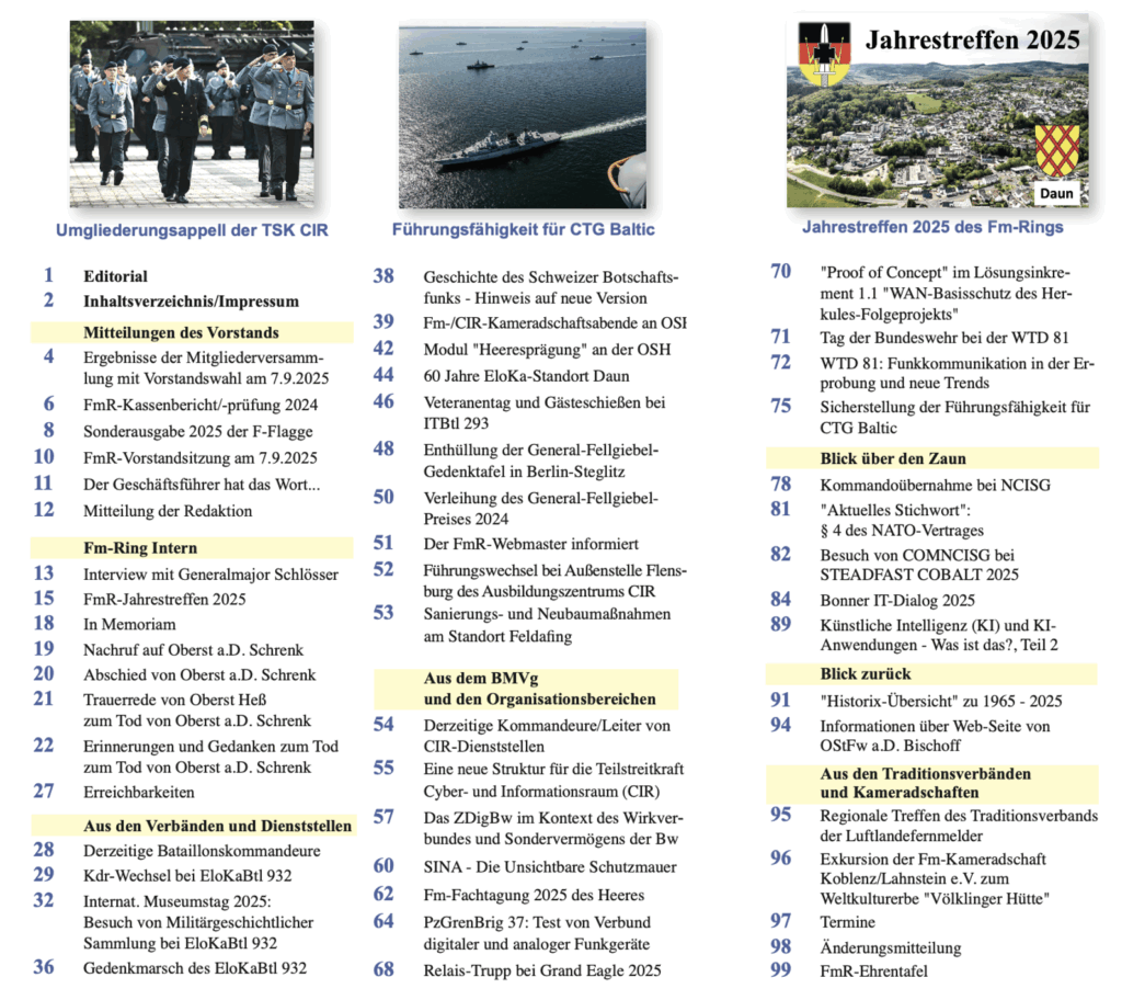Insgesamt wird also wiederum ein breites Spektrum sowie eine „bunte Palette“ an aktuellen und interessanten Themen in der neuen Ausgabe des Magazins des Fernmelderings e.V. für Führungsunterstützung, Informationstechnik, Führungsdienste, Fernmeldetruppe, Elektronische Kampfführung und Operative Kommunikation geboten …